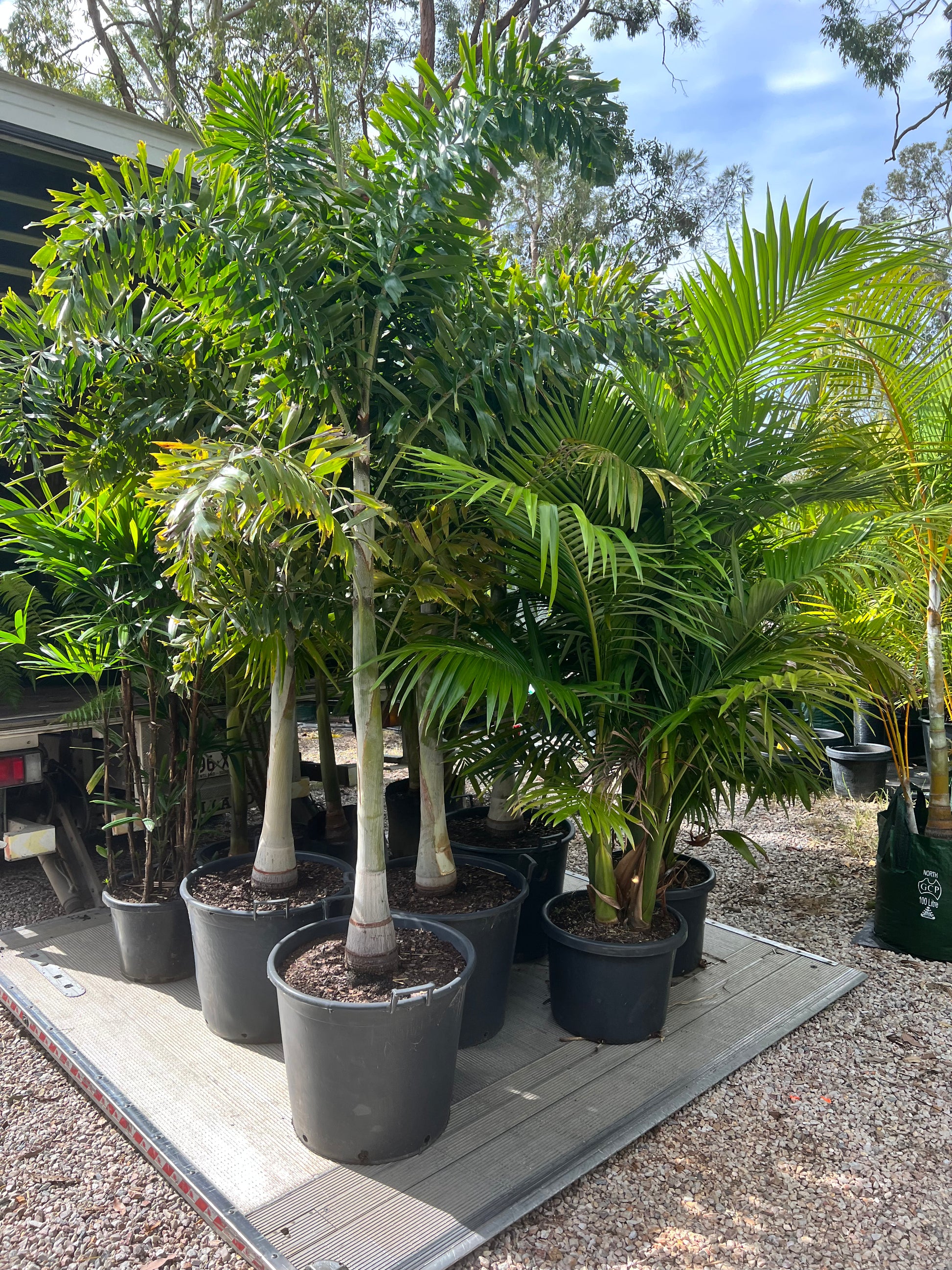 Golden Cane Palm, Alexander Palms, Bangalow Palms, Dwarf Date Palms, Heliconia, Cordyline, Shell Ginger, Elephant Ear, Dracaena, Xanadu, Cascade Palms, Star Jasmine, Giant Bird of Paradise, philodendrons, Tree Ferns and more.